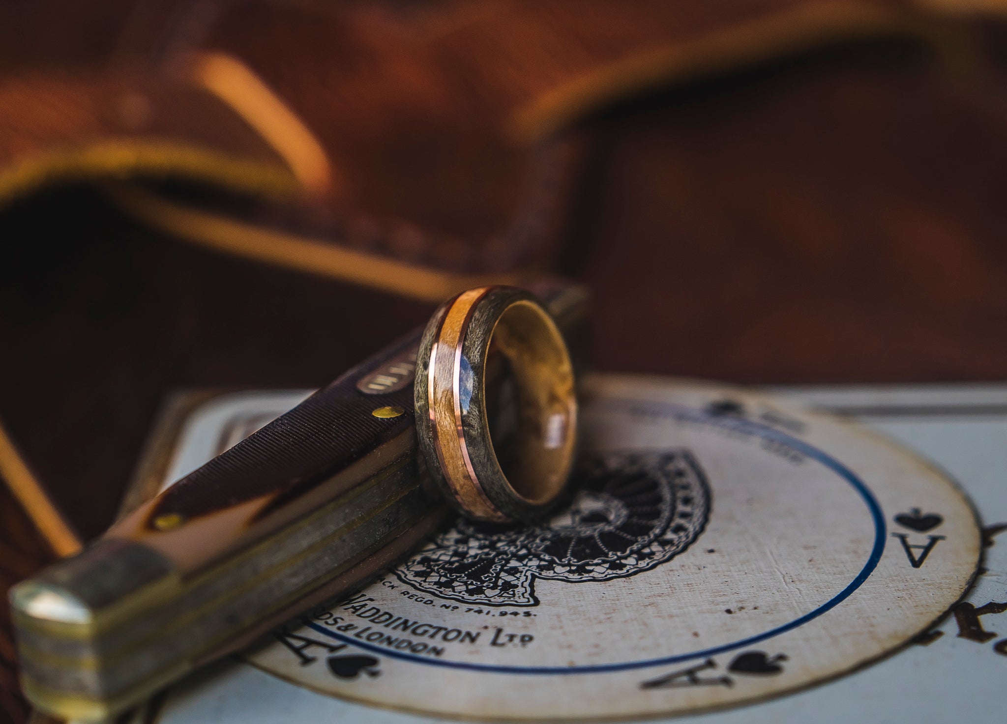 Mens wedding band by Ring + Grove co // Birds eye maple, Grey maple and Copper inlays.